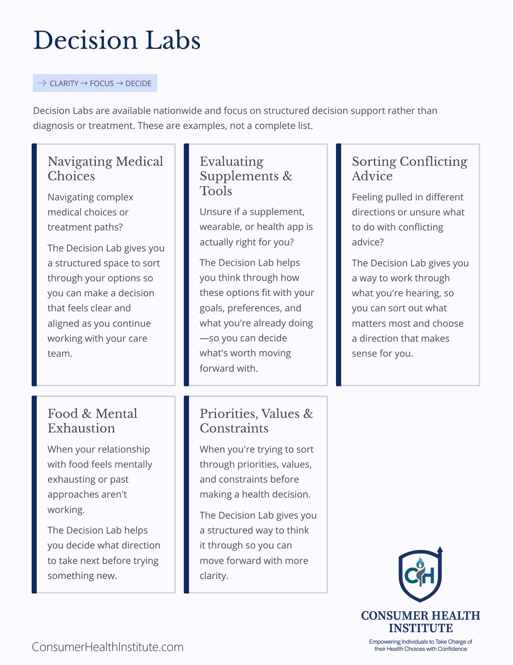 A structured, focused process designed to move you from health decision complexity to clarity, ideal when you need a clear answer or next step.