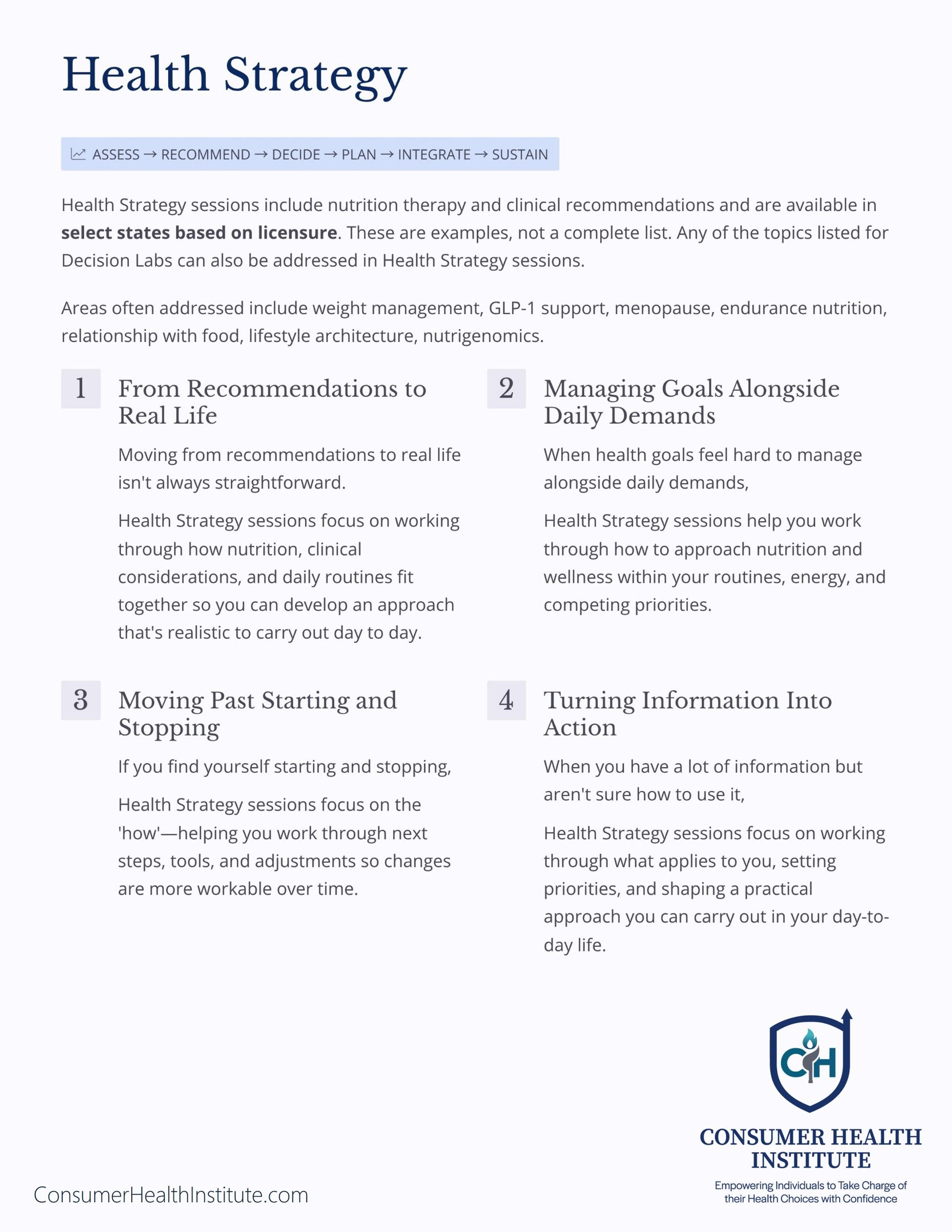 If you're looking for comprehensive nutrition support, a Health Strategy Session is the right place to start. If you need focused help working through a specific decision or figuring out what to do next, a Decision Lab may be the better fit.